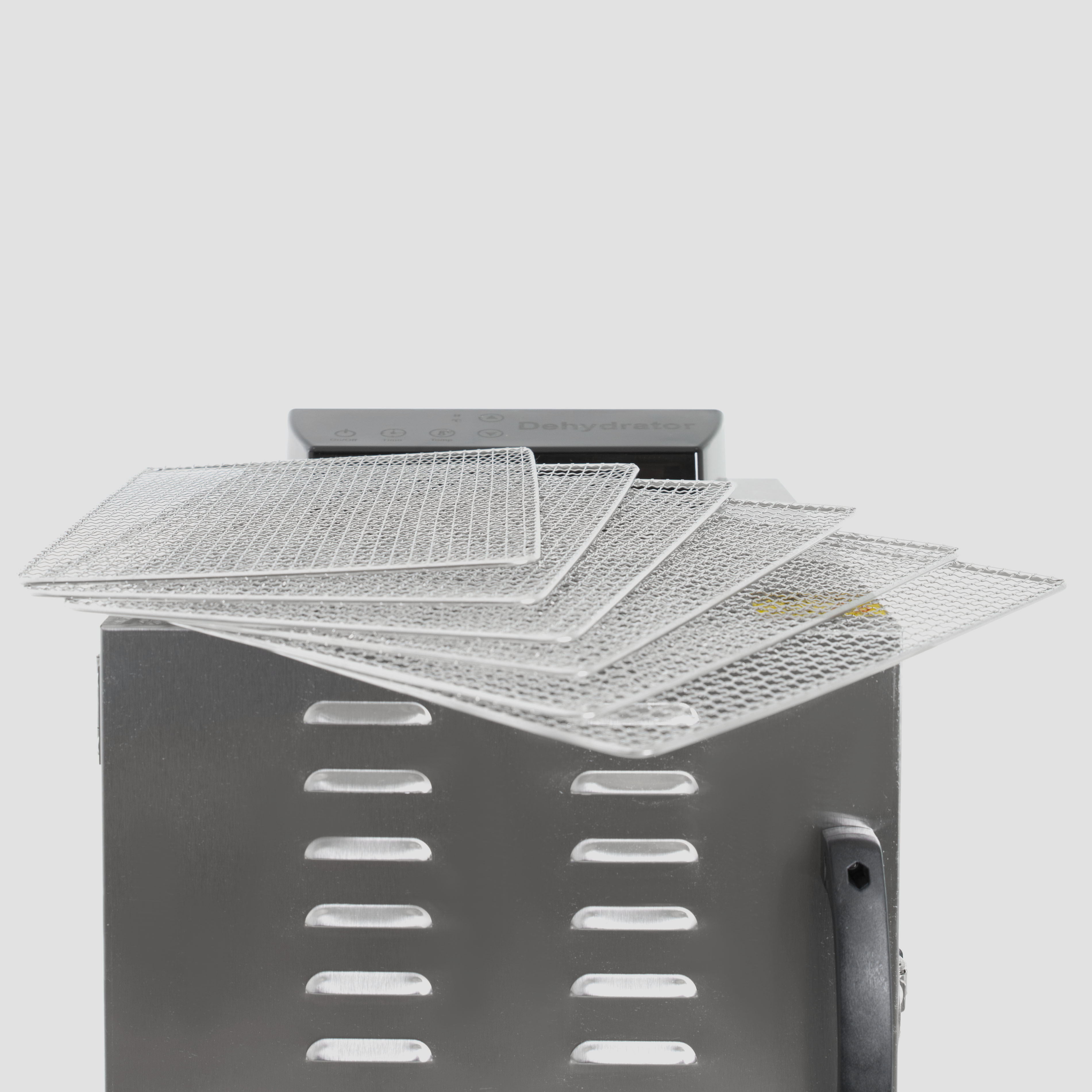 - Компактность и вместительность. Шесть уровней с противнями из нержавеющей стали (280х200 мм, сетка 7х7 мм) и увеличенным межполочным расстоянием (46 мм) позволяют одновременно обрабатывать большой объём сырья. Небольшие внешние размеры (557х300х335 мм) и вес 6,5 кг упрощают размещение и перемещение оборудования.
